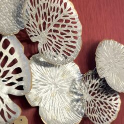Silver metal wall art with leaf edges, finished in gold.