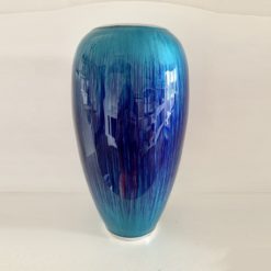 Stunning eye catching handmade vase. Fair trade made by Indian artisans. The vases are made from recycled aluminium, enamelled with a smooth polish in translucent heavenly turquoise and blue. These vases hold water and are hand wash only.