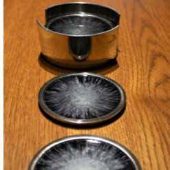 Chic hand made coaster enamel set of 6 in translucent grey and black. Comes with handy coaster holder. Hand wash only.