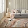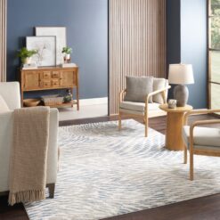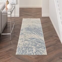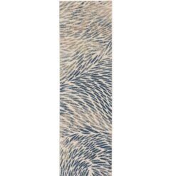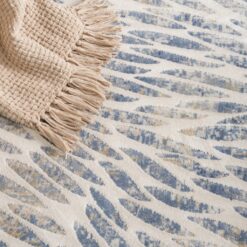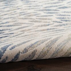 This design has a visual sense of movement of flowing water in tonal blues, greys and neutrals with subtle pile heights creating texture and further movement. Easy clean.