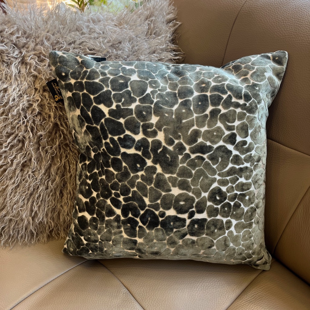 Leopard cut velvet green on a pale taupe background
