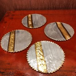 Set of 4 art nouveau style, rippled gold edged coasters set on a grey enamel base with gold stripe.