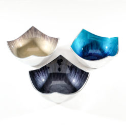 Handmade food safe fruit bowl. translucent jewel like enamel bowl with grey and pearl detailing set on smoothed polished recycled aluminium base. Each one is unique due to the handcrafted nature of this product.