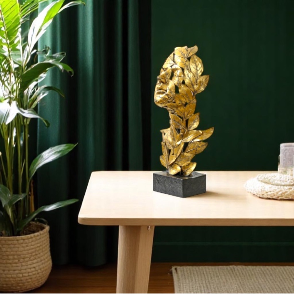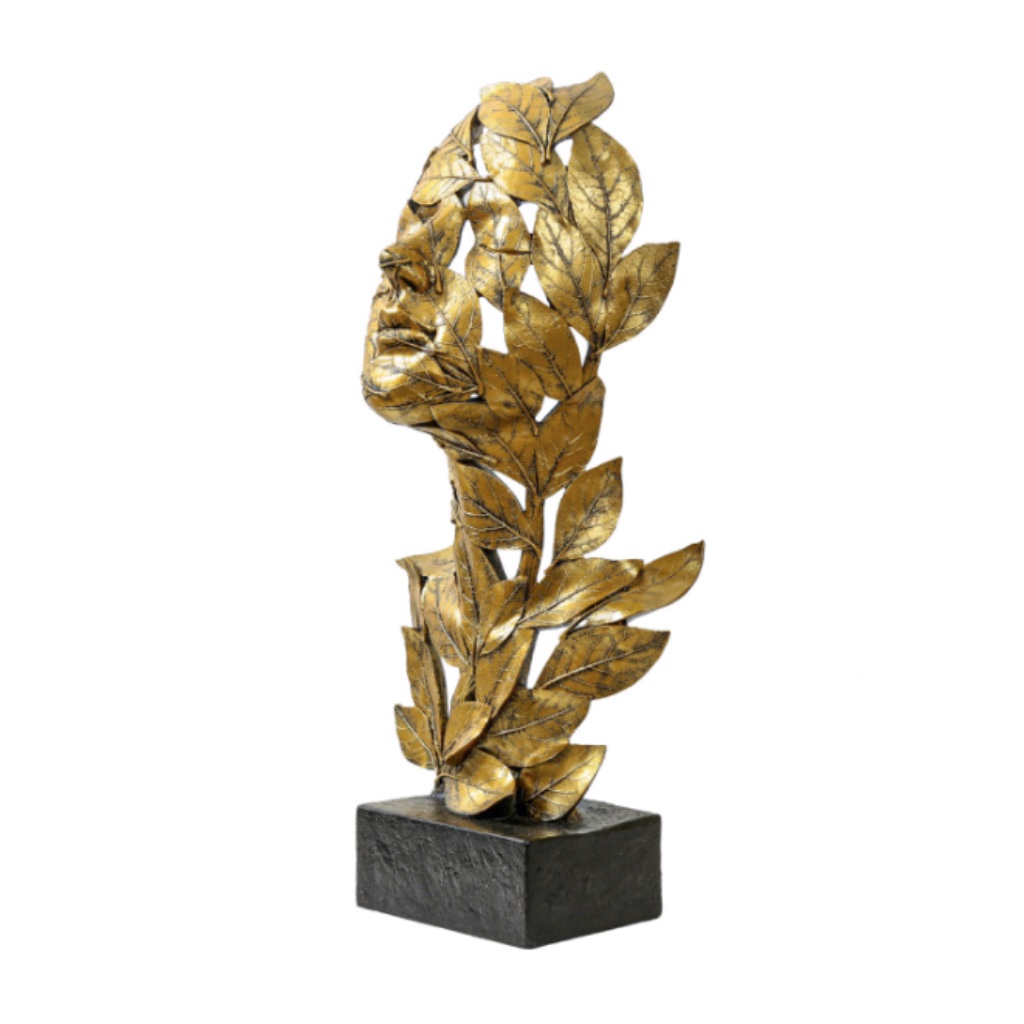 Serence face sculpture emerging through artistic leaf detailing in a warm gold finish.
